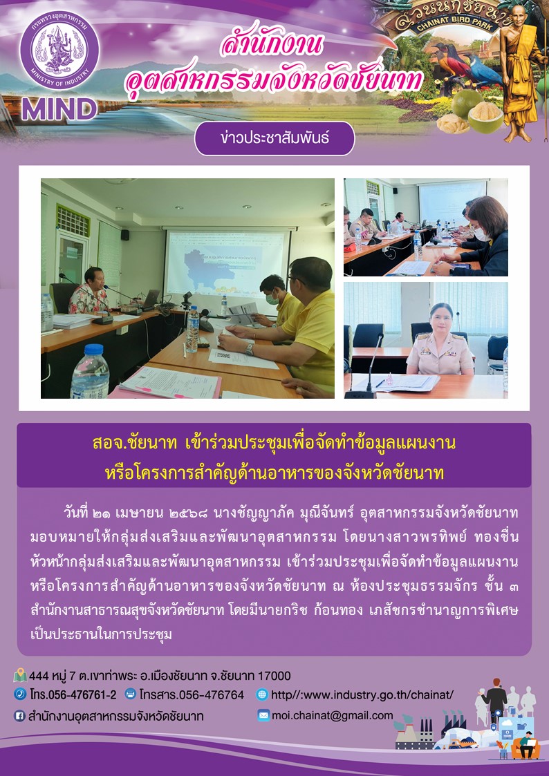 วันที่ ๒๑ เมษายน ๒๕๖๘ นางชัญญาภัค มุณีจันทร์ อุตสาหกรรมจังหวัดชัยนาท มอบหมายให้กลุ่มส่งเสริมและพัฒนาอุตสาหกรรม โดยนางสาวพรทิพย์ ทองชื่น หัวหน้ากลุ่มส่งเสริมและพัฒนาอุตสาหกรรม เข้าร่วมประชุมเพื่อจัดทําข้อมูลแผนงาน หรือโครงการสําคัญด้านอาหารของจังหวัดชัยนาท ณ ห้องประชุมธรรมจักร ชั้น ๓ สํานักงานสาธารณสุขจังหวัดชัยนาท โดยมีนายกริช ก้อนทอง เภสัชกรชํานาญการพิเศษ เป็นประธานในการประชุม